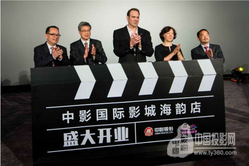 揭幕儀式合影從左至右:珠海城建集團公司董事長張凡先生、中影影院投資有限公司執行董事林民杰、THX全球技術總監Steve Martz 、中國電影科學技術研究所所長張偉女士以及珠海海韻資產管理公司總經理劉建軍先生