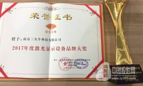 本次大會由中國投影網與中國視聽網、數字標牌網、音響網等八大行業媒體聯合共同舉辦,經過專家組、評委組、網上投票等多種方式層層篩選,在上千家候選企業中,最終評出2017年金孔雀獎。三頭牛科技憑借過去一年在光源技術上的持續創新及多項專利的獲取,受邀出席了本次活動,并再次榮獲行業"金孔雀獎”。