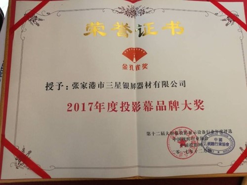 本次大會由中國投影網與中國視聽網、數字標牌網、音響網等八大行業媒體聯合共同舉辦,經過專家組、評委組、網上投票等多種方式層層篩選,在上千家候選企業中,最終評出2017年金孔雀獎。張家港市三星銀屏器材有限公司作為國內最早研制、開發、生產投影幕的生產廠家之一,秉持匠心制造精神,專注提升投影幕產品質量,其“三星”牌投影幕在國內外市場享有極高的聲譽,此次再次榮獲“2017年度投影幕品牌大獎”,不僅是實至名歸,更在業內彰顯出領先企業的氣勢!