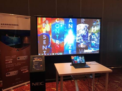 為了滿足越來越多商務辦公的智能化需求,包括NEC CF6600W、CF6700X、CF6500X等新品在內的3款產品,具有NEC MultiPresenter智能協作軟件。巡展現場,通過電腦、平板和手機接入MultiPresenter軟件進行無線互聯,用全高清激光投影機投射出來,實現了無線投影、多畫面顯示、網頁分享、投影控制等功能。此外,智能協作軟件還具備非常靈活的顯示方式,可以同時連接50臺設備,最多支持4*4的16畫面同時顯示,避免了會議時精彩創意無法被迅速分享的尷尬,讓每個與會者都能參與其中。