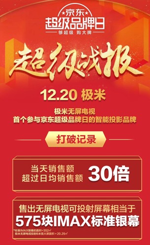 作為京東最重大的節(jié)點(diǎn)之一,京東超級(jí)品牌日結(jié)合了京東營(yíng)銷能力、大數(shù)據(jù)能力、運(yùn)營(yíng)能力和金融能力等,是京東高品質(zhì)、強(qiáng)大電商能力的集中呈現(xiàn)。對(duì)于品牌商而言,超級(jí)品牌日不僅可以拉動(dòng)品牌在京東的銷售,還能加強(qiáng)用戶對(duì)品牌的認(rèn)知。此前參加京東超級(jí)品牌日的企業(yè)多是三星、聯(lián)想、戴爾、美的等知名消費(fèi)電子企業(yè)。在投影行業(yè),極米無(wú)屏電視是截止目前唯一一個(gè)獲此機(jī)會(huì)的品牌,可以說(shuō)是開(kāi)創(chuàng)了行業(yè)先河。