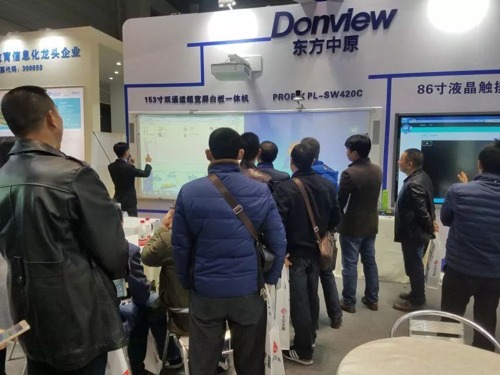 此次展會(huì)上東方中原展出的明星產(chǎn)品--Donview 153寸雙通道超寬屏白板一體機(jī)吸引了大量的行業(yè)內(nèi)外人士駐足參觀,現(xiàn)場東方中原專業(yè)講師,為大家演示及講解產(chǎn)品功能,從產(chǎn)品尺寸、搭配方式、授課書寫流暢程度、PPT演示,多角度的為客戶展示出超寬屏雙通道一體機(jī)的獨(dú)特之處,現(xiàn)場門庭若市,得到了包括中小學(xué)校長、在校教師等專業(yè)的教育觀眾的高度關(guān)注和贊譽(yù),大尺寸、超高清,未來多媒體教室解決方案,盡在東方中原!