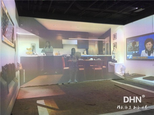 整個(gè)現(xiàn)場(chǎng)搭配7000流明工程投影機(jī),選用11臺(tái)DHN—DX432、1臺(tái)DHN—DW705邊緣融合器,實(shí)現(xiàn)多臺(tái)融合大畫面。以8通道沉浸式板塊為例,左右墻分別長(zhǎng)4.4m ,高3.6m,中墻長(zhǎng)7m高3.6m。根據(jù)其要求,墻面與地面皆用投影來實(shí)現(xiàn),播放視頻時(shí),墻地必須同時(shí)進(jìn)行,實(shí)現(xiàn)墻地聯(lián)動(dòng)效果。根據(jù)這一要求,我司給出“選用8臺(tái)標(biāo)清投影機(jī),分別左右墻一臺(tái),中間墻兩臺(tái),地面配置四臺(tái)投影機(jī),搭配DHN系列邊緣融合器”,實(shí)現(xiàn)墻、地畫面無壓縮融合,打造沉浸環(huán)境,營(yíng)造全方位、立體的身臨其境感。