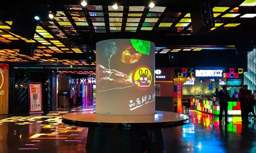 比起頭頂和腳下的暗藏玄機,最吸引人的莫過于中間的曲面光柱,隨手一拍自帶未來感buff加成。2.2米高、直徑1米的圓柱多媒體通過12臺視美樂投影機(SML—PF450)正面投射,自主研發配備電動變焦聚焦鏡頭(1.0-1.7:1投射比的SML—ZL160C),85%的高透過率,亦是國產短焦鏡頭中的翹楚,畫面亮度幾乎無損。投影面積覆蓋光柱體、桌面總直徑長達3米的底部轉盤,無一不清晰細膩的展示整個B1樓入駐商家信息,看著多家首次進駐杭城的網紅美食店的宣傳片,真的是忍不住要歇歇腳,暫時停下來。