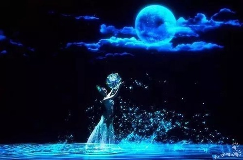 傣族女孩撩起水花輕輕起舞,所踏之處皆幻化成鮮花滿地,她拋下輕紗跳入水中,魚兒紛紛游到她身邊,成群與她共舞。