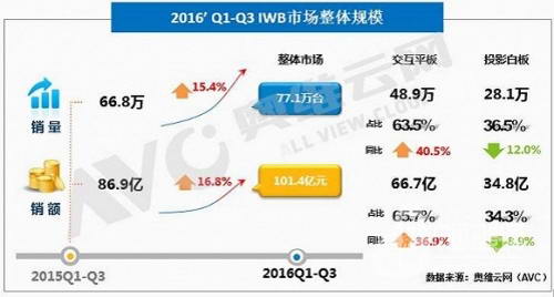 2016年前三季度中國電子白板市場依舊維持穩定增長,IWB市場整體規模銷量達77.1萬臺,同比增長15.4%,其中交互平板,同比增長40.5%。眾所周知,電子白板目前市場主要拉動力是全面改薄的持續推進,而從2013年底至2018年底這五年的規劃,時至今日已經過半,考慮到距全面改薄結束剩下兩年時間,未來電子白板又將何去何從呢?