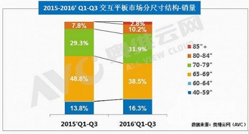整體Q1-Q3IWB市場大尺寸增長明顯,80寸以上市場整體需求不斷增加,歷年來,大尺寸份額的不斷增加是有目共睹的,從下圖我們也可以發現,中小尺寸中,65寸同比份額有很大的下降,70寸有小幅上漲。而從宏觀環境來看,未來兩年,各省全面改薄將會逐步完成,尤其是最后一年,偏遠地區從改薄難度和資金考慮,中小尺寸會成為需求熱點,而現如今,整體交互平板市場價格在不斷下降,70寸對65寸已經形成替代趨勢,所以奧維云網預測,未來兩到三年內,70寸將成為主流需求,在整體市場中占據30%以上的份額。