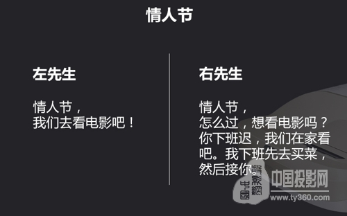 面對(duì)情人節(jié)的保留節(jié)目,左先生:電影開場(chǎng)時(shí)間快到了,我們要抓緊吃了。右先生:你想先吃飯還是先看電影,當(dāng)然家里只有我們,邊吃邊看也是可以的。”