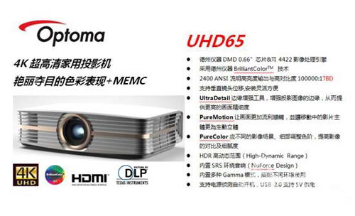 去年,期盼已久的DLP陣營發力4K家用投影機,并未如期而至。而時至2017年,積攢的一波新品總于即將全面來襲。近日,中國投影網從奧圖碼經銷商處了解到,全新4K家用投影機UHD65即將上市,而且還透露了更為全面的信息。