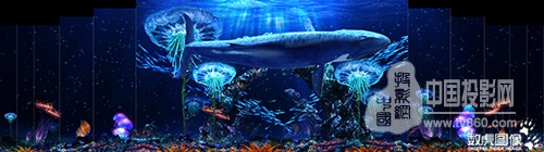 一走進全面升級的夢幻劇場,首先看到觀眾席兩側的海底世界投影效果,以及置于主舞臺前的紗幕和懸掛于旋轉舞臺上的巨大吸幕,包裹式投影效果很好地呈現神秘海底世界的場景。