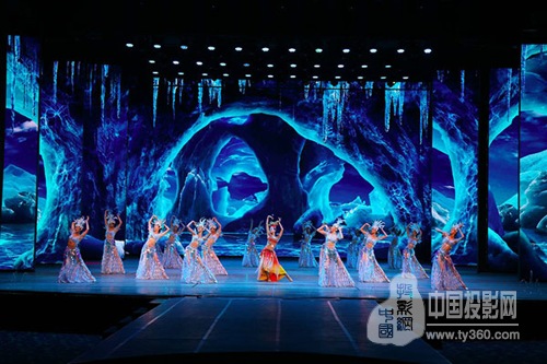 如第一幕“漁水歡歌”中,柔美純凈的音樂響起,符合海洋夢幻神秘的基調,舞美設計方面,紗幕投影呈現波光粼粼的海水和激起的水花,LED舞美則同步呈現立體冰川畫面,為女主阿珠營造在深海與水共舞的美妙場景。