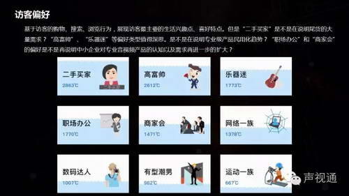 現(xiàn)在關注行業(yè)產品的人,不再單單是行業(yè)的系統(tǒng)集成商,不再是我們傳統(tǒng)思維意識里的人,而是一些更廣義上的“人”。聲視通通過對自身平臺上訪客的留存數(shù)據(jù)分析,基于訪客的購物、搜索、瀏覽行為,展現(xiàn)訪客最主要的生活興趣點、喜好特點。我們整理的對訪客偏好如圖示中的”二手買家“是不是在說明尾貨的大量需求?”高富帥“、”樂器迷“等偏好類型值得深思。是不是在說明專業(yè)級產品民用化趨勢?”職場辦公“和”商家會“的偏好是不是再說明中小企業(yè)對專業(yè)音視頻產品的認知以及需求再進一步的擴大?