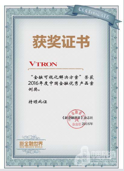 近日,在《新金融世界》舉辦的2016年度中國優秀金融信息化、金融創新成功案例評選中,"VTRON金融可視化解決方案"榮獲2016年度中國金融優秀產品案例獎。