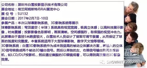 深圳市白雪投影顯示技術有限公司將于2017年2月7日至10日參加荷蘭ISE國際視聽及系統集成展,誠邀您現場參觀。