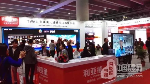 在利亞德光電股份有限公司的展臺上,可以見到TWA系列高清無縫拼接LED顯示墻,TWA1.25,尺寸9600mmX2700mm,分辨率達7680X2160,此外還有VVM 1.875、VVM1.58、VED3、VED2.5等不同尺寸或分辨率的LED顯示屏產品,以及金立翔TVsn1.9可彎曲小間距顯示屏。