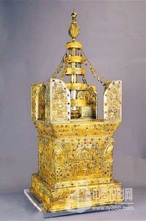 阿育王塔 --- 南京大報(bào)恩寺遺址長(zhǎng)干寺地宮發(fā)掘出土的鎏金七寶阿育王塔高1.1米、寬40厘米,總重50公斤,是中國(guó)和全世界范圍內(nèi)已發(fā)現(xiàn)的最大規(guī)格的阿育王塔,堪稱世界阿育王塔之王。