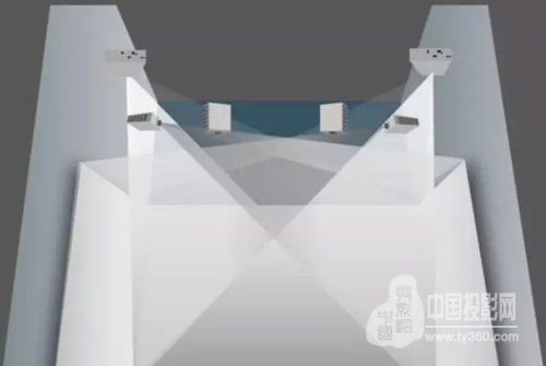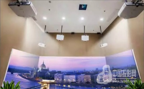 在3D沙盤的展廳內側還有一間“沉浸式3D影音室”,是展廳精心打造的3D體驗廳,安裝了6臺愛普生高端工程投影機,分成3組以不同的投射角度吊裝在屋頂上,利用投影機“內置幾何校正功能”和“多屏幕拼接系統”將投影的U型畫面融合成一個整體。