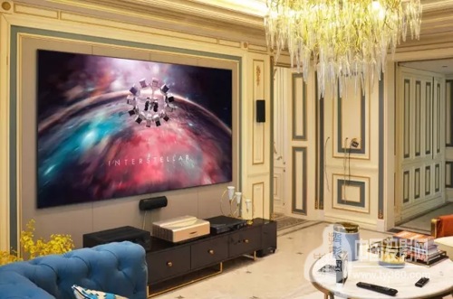 據視美樂長春代理商趙總介紹,客廳影院體驗區面積大約40平米左右,整體裝潢采用歐式風格,電視墻按照100寸寬屏尺寸留出空白用于安裝。與視美樂激光電視搭配的光學屏幕厚度僅為1CM,屏幕下方安裝中置音響,緊跟其下的一體式電視柜上擺放著激光主機、藍光播放器等設備。整個電視背景墻無需再做特別裝飾,空間分配合理,與整體風格完美契合。
