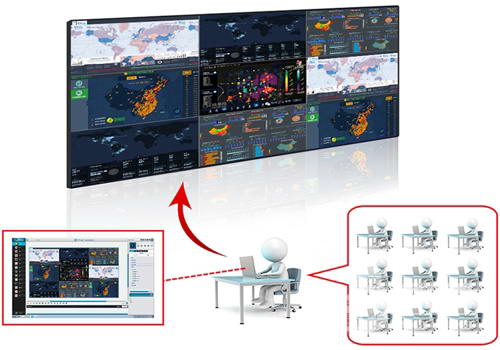 藍點大數據通過一套專有的數據分析系統了解業務狀況,通過拼接顯示屏對各類數據信息進行分析,然后得到數據結果。由此,如果采用傳統的拼接技術實現數據上墻顯示,需要建立多個計算機群組,通過一人一機操控畫面顯示。這種拼接架構易導致系統延時、畫面不同步、信號受損、成本過高。相對于這種架構,MCS云架構的數據接入方式非常靈活,“一機輸出”代替傳統架構中的計算機群組,將行業大數據軟件、組態軟件、GIS與GPS系統等,以IE窗口形式輸出到大屏,并且采用隱藏式導航欄設計,將大屏畫面點對點分割顯示輸出為整體超大型數據場景。就技術而言,MCS云拼接顯示系統采用跨瀏覽器的HTML5和跨平臺的JAVA技術,能夠將信息可視化的柱形圖、曲線、餅圖等形式的多類型數據以交互、全面、所見即所得的顯示效果顯現。