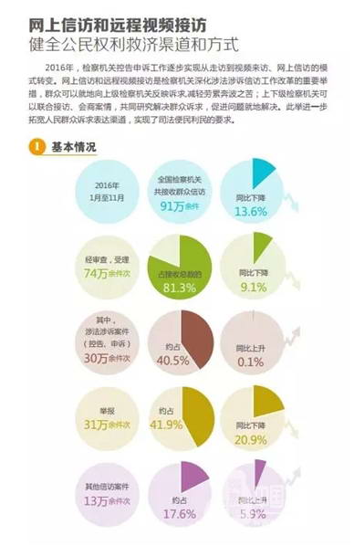 2016年,檢查機關控告申訴工作逐步實現從走訪到視頻來訪、網上信訪的模式轉變。網上信訪和遠程視頻接訪是檢查機關深化涉法涉訴信訪工作改革的重要舉措,群眾可以就地向上級檢查機關反映訴求,減輕勞累奔波之苦,上下級檢查機關可以聯合接訪、會商案情,共同研究解決群眾訴求,促進問題就近解決。此舉進一步拓寬人民群眾訴求表達渠道,實現司法便民利民的要求。