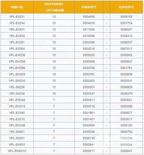 對象產品的投影機在使用一段時間后,部分機器可能會出現ON/STANDBY LED閃爍13次(或者7次)的無法開機現象。