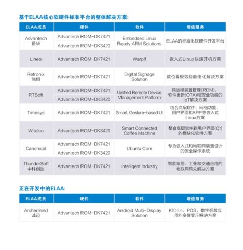 其中,ELAA標(biāo)準(zhǔn)開發(fā)平臺(tái)伙伴,提供基礎(chǔ)核心硬件平臺(tái)以及軟件開發(fā)工具包(BSP);硬件差異化服務(wù)伙伴,則進(jìn)一步結(jié)合底板設(shè)計(jì)、系統(tǒng)整合,以提供硬件客制化、差異化服務(wù),進(jìn)而滿足各式嵌入式或工業(yè)物聯(lián)網(wǎng)應(yīng)用對(duì)硬件的需求;軟件加值整合服務(wù)伙伴,建構(gòu)在上述兩層的基礎(chǔ)上,開發(fā)符合客戶應(yīng)用所需的嵌入式Linux或Android操作系統(tǒng),并協(xié)助客戶發(fā)展其應(yīng)用所需之軟件加值服務(wù)。