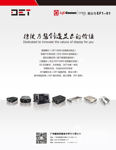 作為全球領先的視頻顯示系統解決方案提供商——DET將展示3200-30000流明系列新品激光投影機、DET液晶拼接大屏、商業顯示器、多媒體互動、無線會議協作系統等產品及行業應用解決方案。