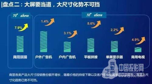 規模了解完之后接下來我們來看一下商顯領域的屏幕尺寸變化,商顯各類電子產品屏幕尺寸度以大的形式大規模增長,向70寸以上的屏幕以近似百分之八的同比增長,由此可知商用大尺寸趨勢已經勢不可擋,像戶外廣告機、戶內廣告機、平板拼接,50寸以上的以上升趨勢呈現。