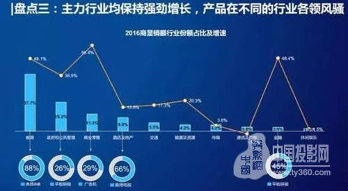 接下來我們看一下商顯產品在各個行業領域的風騷走向,從左到右,我們看到最高的當屬教育行業,教育行業主要教育信息拉動,在市場中商顯拼接占有88%的份額,其次是政府與公告的管理,期間包括APP項目的拉動有關聯占市場的百分之二十六。之后是商業零售的百分比,像在4S店的應用也是極大拉動了商業零售的需求增長,從各個領域整合來看屏幕通吃各行各業。