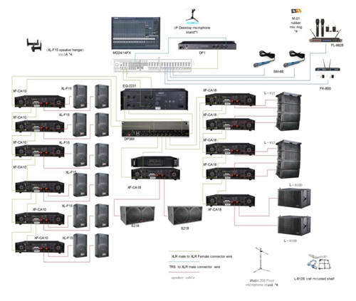 左右聲道主擴聲采用Jusbe(佳比)全新的雙十二寸三分頻線陣列系統L812,每組4只全頻線陣列揚聲器分別吊裝在舞臺兩側,Jusbe L812線陣系統能夠用均勻的方式組成平滑的響應曲線和覆蓋面,就算是極難覆蓋的地方,也能產生驚人的清晰度和均勻、細膩的聲音。
