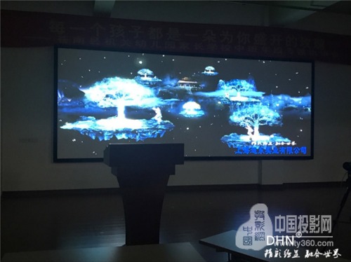 多功能報告廳使用的是平面金屬硬幕,是DHN為幼兒園量身定做的尺寸,然后運到現場進行組裝,DHN金屬硬幕采用高清樹脂材質,具有成像效果好,使用壽命長的優點。根據選擇的工程投影機和硬件融合的融合帶大小最終確定尺寸為5.23*2.1米。