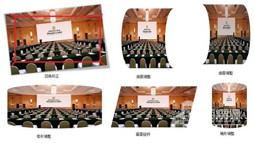 通過幾何校正功能,可以在無需配備任何外置硬件的情況下, 對投射到例如弧形幕,桶形,曲面等特殊屏幕上的圖像進行調整 。采用了高性能圖形處理芯片, 高速處理, 高畫質進行畫面四角校正畫面旋轉 ,極大的增強了安裝調試的自由度 。