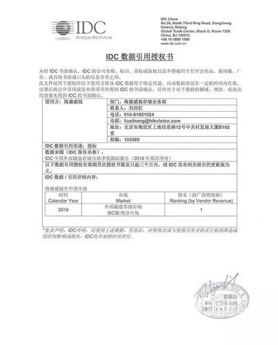 日前,全球權威調研公司IDC公布了最新的《中國企業級存儲系統市場調查數據報告》,數據顯示,2016年度IP存儲銷售額第一和出貨量第一再次雙雙榮歸海康威視。