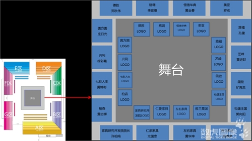 在講述這一獨特的立方體秀舞臺之前,我們先來看下舞臺分布圖。觀眾席分A/B/C/D/E/F/G七個區,主控播臺位于A區。秀場舞臺是正方形結構,舞臺之上搭建了一個內接同比例立方體,由舞臺地面(9 x 9米)和四面紗幕(各6 x 9米)組成立體結構。A 區正對一面紗幕,位于主觀演區,其他六區分別兩兩對應一面紗幕。