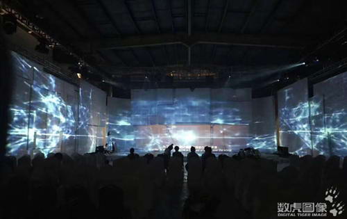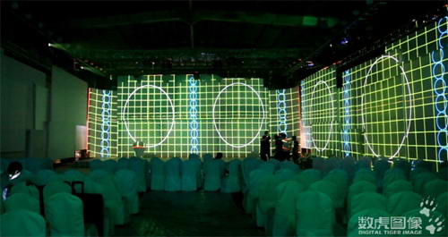 開幕式現場搭建了多層結構的投影幕,通過13臺20000流明投影機,投影呈現一個半包裹式舞臺視覺框架。