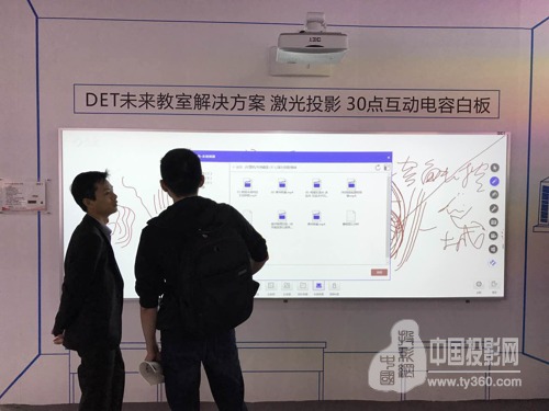 在教育領域方面,DET則亮出兩套不同的教學解決方案:科教一體機直投墻面觸寫、30點觸控互動電容白板組成未來教室。