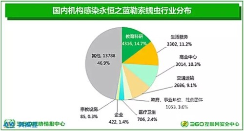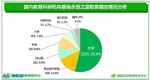 小威了解到,此次遭受病毒攻擊最為嚴重的是教育科研領域。據360威脅情報中心14日上午發布的數據顯示,截止到5月13日20點,國內有29372家機構組織的數十萬臺機器感染,其中有教育科研機構4341家,是此次事件的重災區。