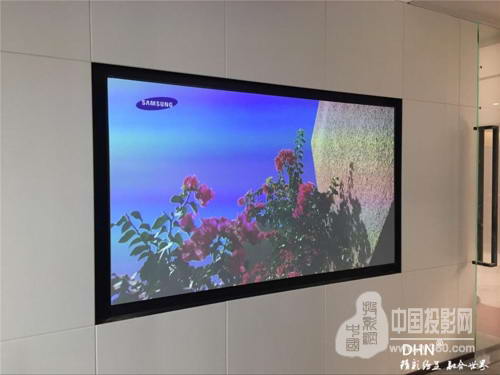 上海磐平網(wǎng)絡(luò)信息有限公司會議室采用DM907搭配抗光幕,現(xiàn)場采用的是鑲嵌式的方式安裝幕布,對于開槽的精確度以及背面安裝的架子準(zhǔn)確度十分的高,但是在迪東技術(shù)人員的專業(yè)程度上面,安裝的很到位,幕面和墻面平齊一直。項目使用DM907自帶的幾何矯正功能,只用了近十分鐘的調(diào)試時間。且DM907采用最先進(jìn)的超短焦聚焦鏡頭,可以120寸畫面不需焦,保證了文字的清晰度。