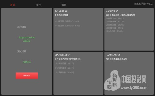 配置方面,光峰A1的CPU為ARM Cortex A9,GPU為Mali 450,運行內存為2GB DDR3,存儲空間為8GB eMMC,安兔兔跑分TV版測試高達3萬,對于一款智能投影儀來說,這個跑分成績已經(jīng)比較給力了!其他品牌同價位的投影儀,大多數(shù)在1萬 ~ 2萬之間。