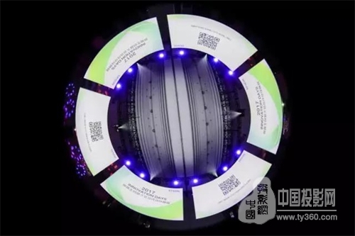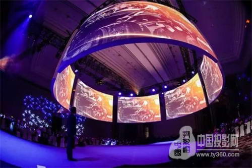 創新大會晚宴現場的這一雙面弧幕投影,就成為了當日的焦點之一。6片弧形長方形屏幕組成一個圓形“陣列”,屏幕內外雙面均可看到投影內容。該圓形“陣列”懸掛在圓形舞臺上方,大小、方位都非常適宜,既奪目別致,又不會擋住舞臺,是非常適合酒店宴會演出的設計。