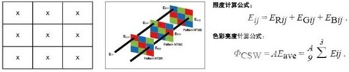 技術人員會分別測試NTSR,NTSG,NTSB 測試圖樣中每個色塊中心點照度值的平均值,再與測試圖像的面積相乘,得到色彩