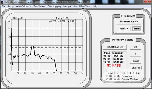從下面兩張Flicker測試波形圖也可看到:投影的實測值高于-45dB——人眼能感受到的閃爍頻率,但使用年限相同的交互智能平板則依舊穩居安全值內。