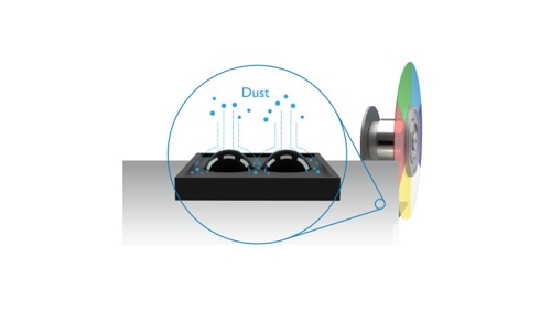 傳統DLP投影機多采用凹型紅外色輪傳感器,利用紅外線在反光面的反射光信號判斷色輪轉動,若有灰塵堆積,覆蓋紅外定位點,光信號傳遞就會受到影響。因此積灰后,投影機常會感應不良造成顏色錯誤甚至突然關機。