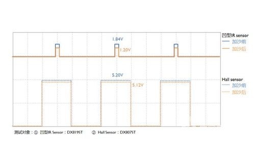 為了證實磁感應色輪的防塵性能,我們做了專門的驗證試驗。分別在色輪傳感器上方開孔,各加入1g關東沙,凹型紅外感應色輪的脈沖信號由最初的1.84V下降到1.20V,下降近34%,投影畫面開始出現閃屏;而磁感應色輪的脈沖信號由起始的5.20V下降到5.12V,下降了1.5%,投影畫面幾無影響。此外,當加到5g關東沙后,傳統凹型紅外感應色輪已經難以轉換出明顯脈沖信號,而磁感應色輪即使加到40g以上仍有脈沖信號顯示,投影機照常運作,防塵性能足足提升了8倍有余!