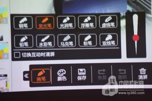 神畫TT-P觸控投影在“電子白板”這項功能上,花費了巨大的心血和研發精力。僅批注中的畫筆選項,就有鋼筆、熒光筆、光潤筆、浮雕筆、鉛筆、水彩筆、馬克筆等幾十款樣式。而顏色選項更是將“PhotoShop”的顏色盤譜都照搬過來了,顯得尤為專業。