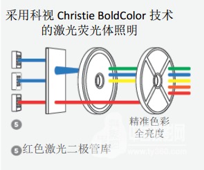 傳統的激光熒光體使用藍色激光二極管作為主要光源,藍光射向涂有熒光體的旋轉色輪并激發黃光,再通過分色涂層分離黃光,生成紅光和綠光,分離后的紅光、綠光和藍光投射到DLP芯片等成像芯片,最終通過鏡頭投射到屏幕?埔旴oldColor在激光光源、多種光學元件以及視頻處理軟硬件等多方面進行改進,在不依賴信號失真的前提下實現高亮度、細膩動人的畫面。傳統的激光熒光體的最大痛點在于紅光不足,科視BoldColor技術增加了紅色激光二極管,為色輪中的其他色段節省區段空間,紅色和藍色激光二極管的結合在提高色彩精確度的同時保持系統效率,得到更高的光輸出和精確的色彩。