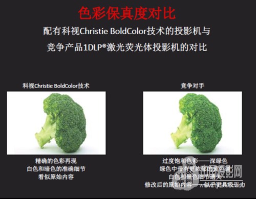 激光熒光體放映由于亮度高、壽命長、維護成本低等優勢受到廣泛應用,然而亮度和色彩保真度不可兼得的固有缺陷成為了限制其蓬勃發展的瓶頸。各大廠商往往選擇失真和修改視頻信息的方式來提高亮度,一種方式是消減黑色和白色并過度飽和色彩,導致圖像看似具有沖擊感,實則失去高光和低光等畫面細節;另一種方法是提高黃色或綠色,但會破壞皮膚色調并留下白點。與大多數廠商的做法不同,全球視聽領導者科視堅持視頻內容不可修改的原則,創新的BoldColor技術利用紅色激光二極管以及專利光室、專業保護軟件,將畫面按創作時一樣精確顯示,在高亮度下依然絢麗而真實,符合Rec. 709標準高清色彩。