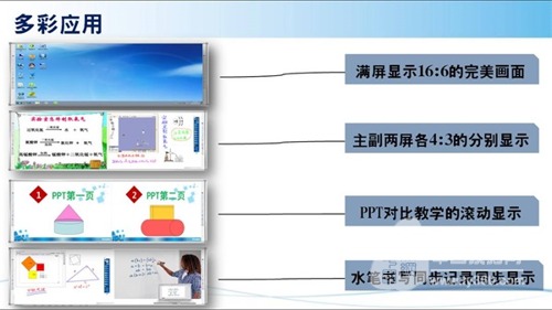 當(dāng)老師想實(shí)現(xiàn)在同一屏中進(jìn)行PPT的滾動播放(一邊播放PPT上一頁,另一邊播放PPT下一頁),達(dá)到對比教學(xué)的更好效果,而傳統(tǒng)的觸摸屏和電子白又無能為力時,我們該怎么辦?當(dāng)老師想實(shí)現(xiàn)在電子白板上進(jìn)行觸摸交互,又能用水性筆書寫批注,還能同步記錄下水性筆板書的內(nèi)容時,我們又該怎么辦?'科技就是生產(chǎn)力','創(chuàng)新就會出奇跡'。東方中原不負(fù)廣大師生的重望,在以創(chuàng)造最好最實(shí)用的教學(xué)設(shè)備回饋教育為使命,以創(chuàng)新為靈感、實(shí)用為基礎(chǔ)的研發(fā)理念下,振撼上市'145'雙通道超寬屏白板+16:6的激光投影機(jī)的未來教室解決方案'。同時又完美結(jié)合教學(xué)一體機(jī)高集成、易操作、便安裝的優(yōu)勢,升級推出'153'雙道道超寬屏教學(xué)一體機(jī)+16:6的激光投影機(jī)未來教室解決方案',并如期亮相今年福州的普教展。