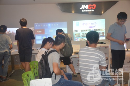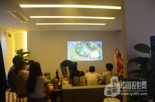 循著眾人集聚的產(chǎn)品陳列臺方向,各類大屏投影顯示畫面映入眼簾,即使投在墻上,投影畫質(zhì)仍明亮、清晰。小編迫不及待的體驗(yàn)了一把。