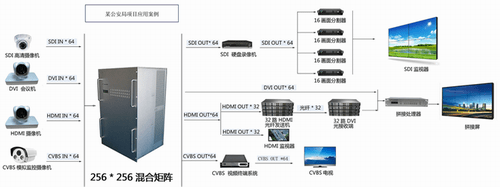 本案例充分的展示了該系統性能強大,該例核心矩陣擁有64路SDI輸入、64路DVI輸入、64路HDMI和64路CVBS輸入,本案例是針對公安系統錄像設備豐富、錄像設備各種輸出接口樣式多、多屏拼接顯示且需要具有一定的遠距離傳輸能力而研制的一套強大的視頻處理傳輸系統。